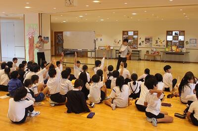 落語体験では、想像力を膨らませ、扇子と手ぬぐいだけを使う動きを教えてもらいました。子供たちは、扇子を使って蕎麦を啜る真似をしたり、手拭いを熱い焼き芋に見立てて食べるしぐさをしたりして、落語の面白さを体験しました。
