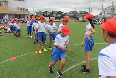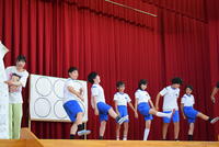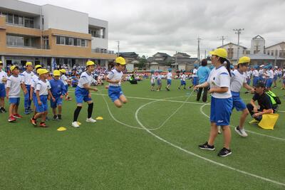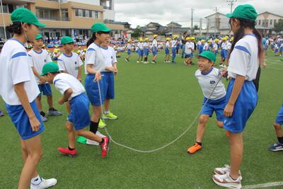 今日は運動会のなかよし班競技「跳んで跳んでハッピー!」の全体練習がありました。各団これまでの練習を生かし、タイミングよく縄に入ったり、連続跳びに挑戦したりしていました。これまでで一番よい記録を更新したチームもあり、本番に向けて子供たちのやる気も上がってきています。