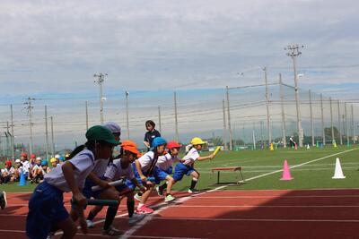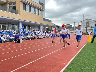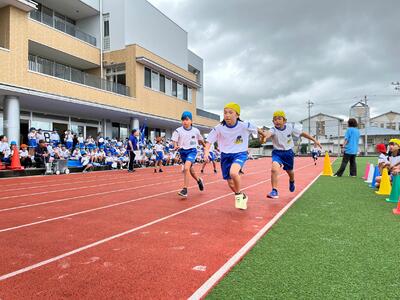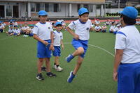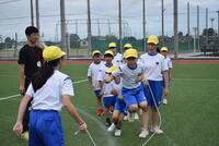 リレーやなかよし班競技は、本番同様に行いました。各団席からは「がんばれ!」「いけー!」など大きな声援が。途中、可愛いお客さんも中央っ子の頑張る様子を見にきていました。