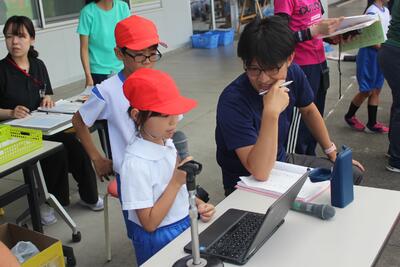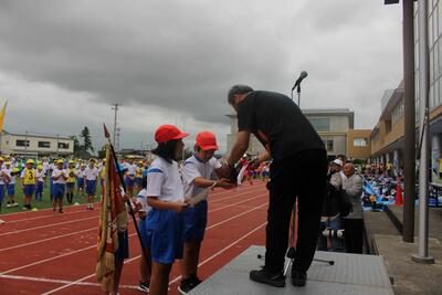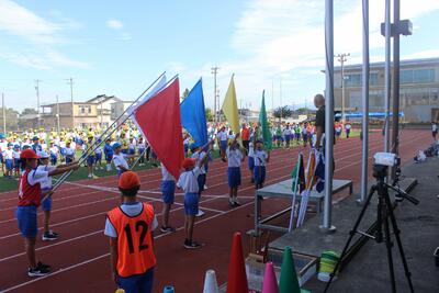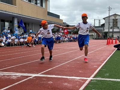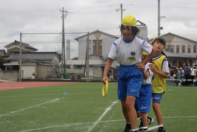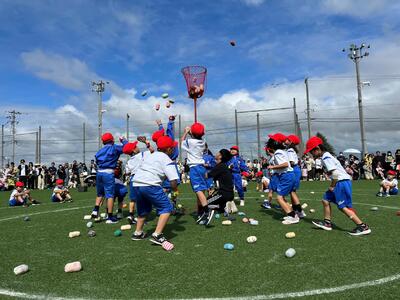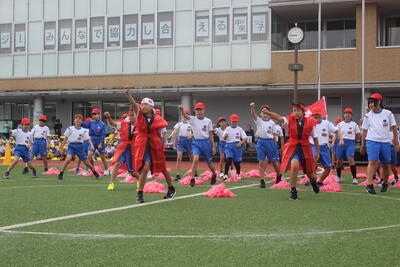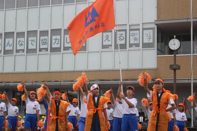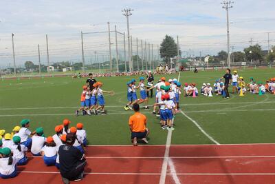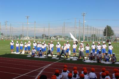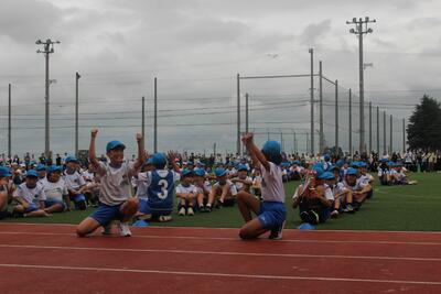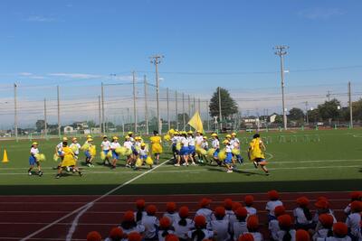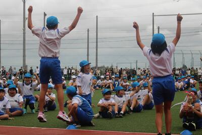 応援合戦で自分の団の5・6年生の応援を初めて見た下級生たち。応援合戦が終わった後は、自分の団の応援を真似する子供たちの様子も見られました。