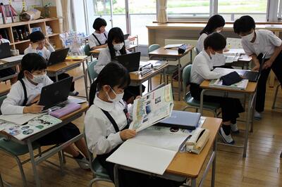 1組は社会科で、浄水場について調べました。図書資料やインターネットを活用し、浄水場でどのように水をきれいにしているのかについて情報を集めました。来週は上水道管理センターと、浄化センターに見学に行きます。