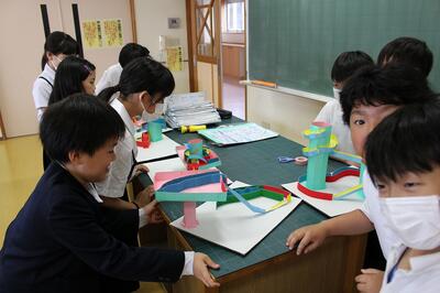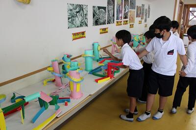 3組も図工の様子です。厚紙やカラー段ボールを使って、ビー玉を転がして遊ぶ作品作りに取り組みます。今日は、他クラスの作品を見て、自分がこれからどのような作品を作るかについて考えました。