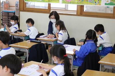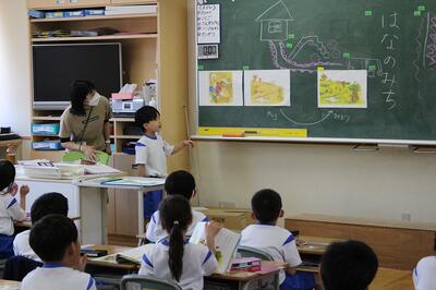3組は国語の様子です。「はなのみち」というお話の、挿絵を見て、物語の展開を予想しました。