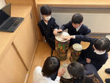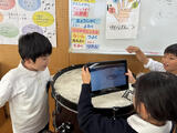 3年生の理科では、音の伝わり方について学習しています。学習を通して音が出ている楽器を触ると震えていることに気付くことができました。その経験から「大きい音を出したら、どうなるのかな?」という子供の発言があり、今日はいくつかの楽器で音の大きさを変えながら、震えの大きさは変わるのか実験をしました。「見て見て、ビーズが踊ってるみたい」「水は音が大きい方が高くまで上がっているよ」「他の人の太鼓の音でビーズが震えているような気がするな」と、音の大きさと震え方の関係について考えました。