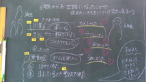 6年生の卒業が近づいていることから、「かっこいいな」「やさしいな」といった姿や、してもらって「うれしかったこと」など、6年生との思い出を話し合いました。3年生の子供たちは、「たてわり班の時に、楽しいゲームを考えてくれてうれしかったよ」「運動会の時に、やさしくムカデ競争のやり方を教えてくれたよ」と自分の経験を振り返りながら、6年生への感謝の気持ちを高めていました。