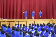 今日は、立山町と舟橋村の小学5年生が立山中央小学校に集まり、GoGoフェスティバルを行いました。他の学校の子供たちと楽しく関わって仲を深める姿や、拍手やかけ声などで集会を盛り上げようとする姿がたくさん見られました。Aさんは、開会式で児童代表の言葉を大きな声で堂々と話したり、Bさんは、猛獣狩りで他の学校の子供を積極的に誘ったりしました。