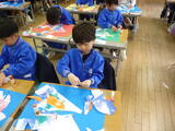 図画工作科の学習では、ローラーを使って模様を付けたり、紙を切って生き物を形作ったりしています。紙を切りながら、「あ、ペンギンみたいだ」 「これ、腕に見えるよ」と、想像を膨らませて楽しく作品づくりに取り組みました。子供たちの自由な発想からたくさんの生き物たちが生まれました。作品は学習参観の際に各教室廊下にて掲示しますので、ご覧ください。