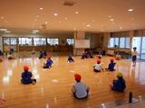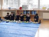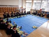 3時間目に机を運んだことで、給食の時に机といすがありません。そこで『ブルーシートを敷いて、遠足給食』をしました。みんなで一つの丸をつくって、楽しくお話したり放送を聞いて給食を食べました。