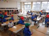 算数の時間には、三角形の色板を並べていろいろな形をつくりました。初めは手本通りつくるのに手間取っていましたが、たくさんつくっていくうちにだんだんと慣れ、「先生!パンダができたよ」「お城ができた」「大きなさんかくだよ」と、最後には思い思いに形づくりを楽しむことができました。